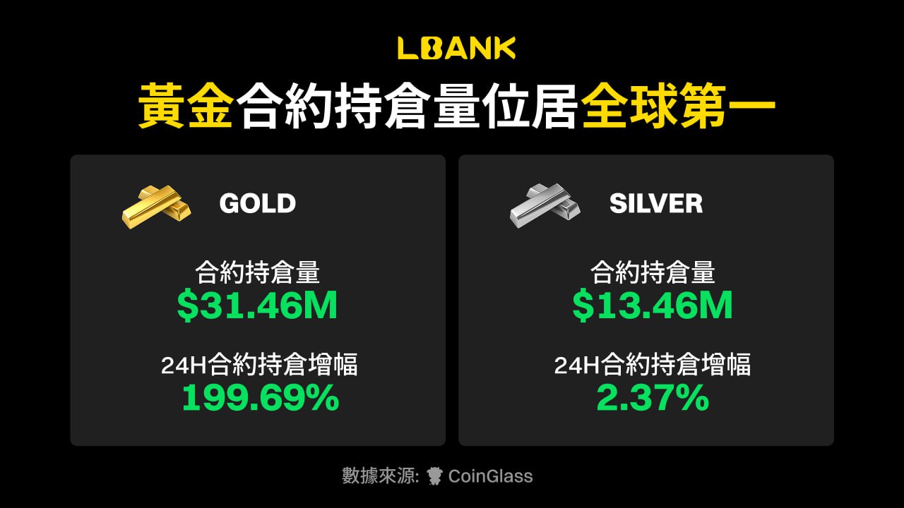 Coinglass 數據顯示,LBank GOLDUSDT 合約持倉量達3,146 萬美元,持倉量排名全球Top 1,24 小時增幅 199.69%;SILVERUSDT 合約持倉量達 1,346 萬美元,24 小時增幅 2.37%,合約持倉增速位居全球Top 1。